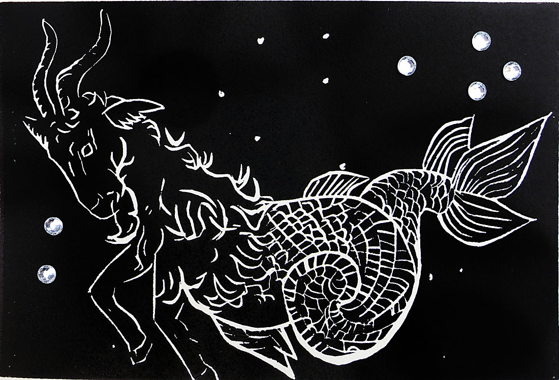 I am doing an early release of the print, because today is my friend Audra’s birthday. In celebration of her birthday I carved a Capricorn Goat Fish, making one print extra special  with 6 bedazzled rhinestones. Maybe by the end of the day I will add another 8, one on each star. Happy Birthday Audra!