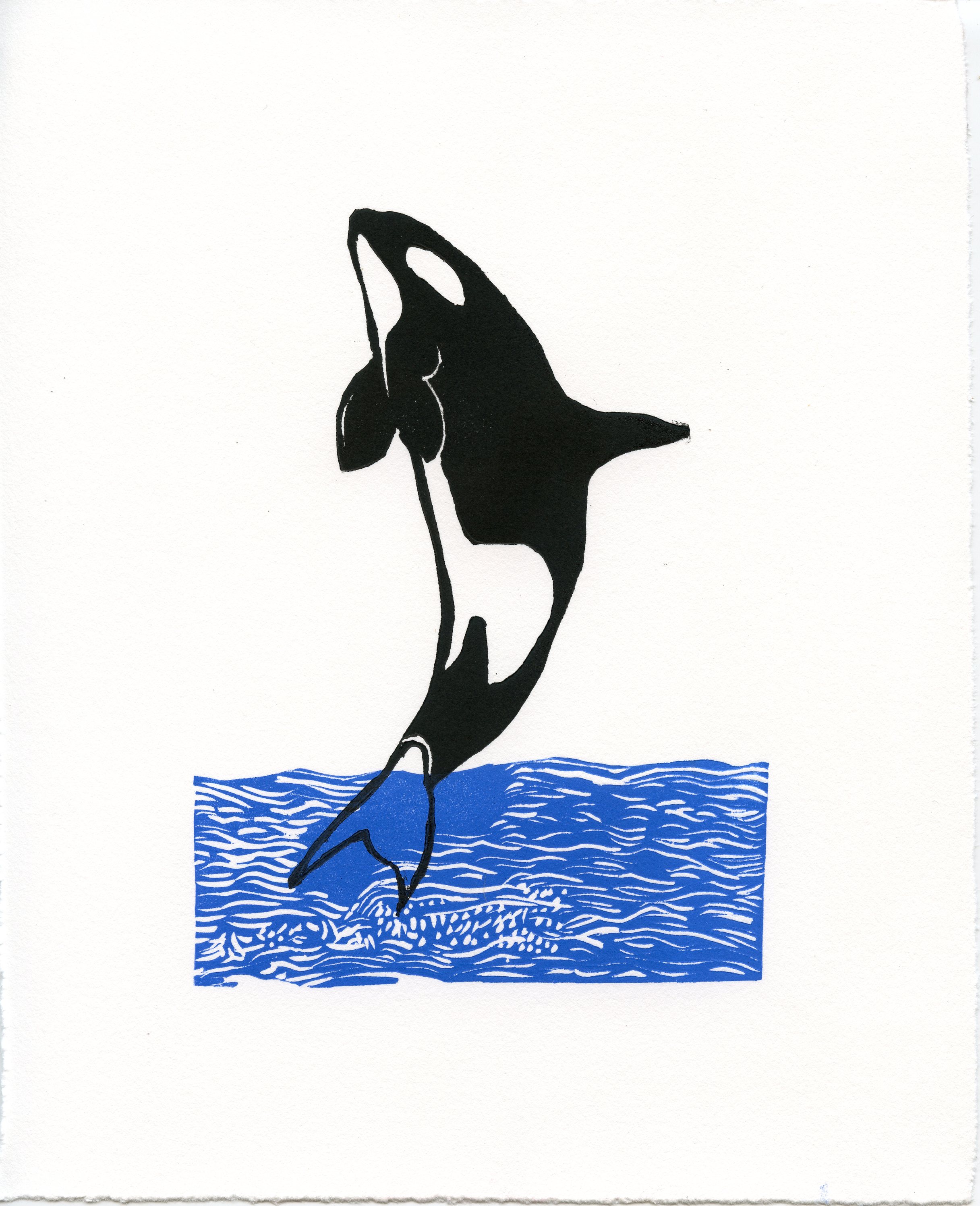 “Free Willy” is a two color linocut with blue water and a black Orca.