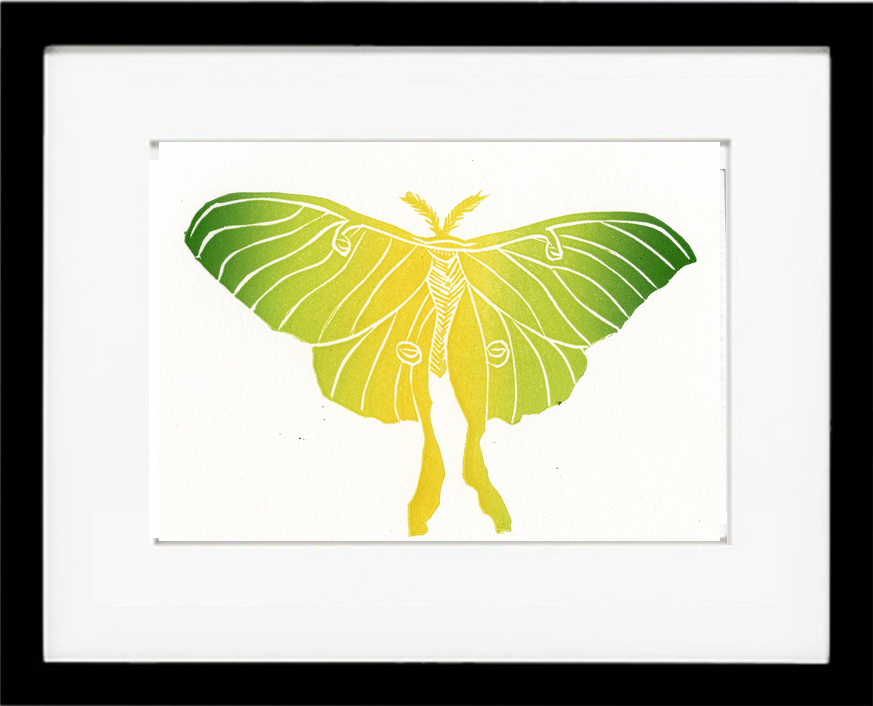 The is a beautiful yellow to glowing green to dark green Luna Moth. This is the first print to also get it’s own t-shirt, you can see it all on Etsy. The image is 4″ x 6″ and printed in an edition of 10.
