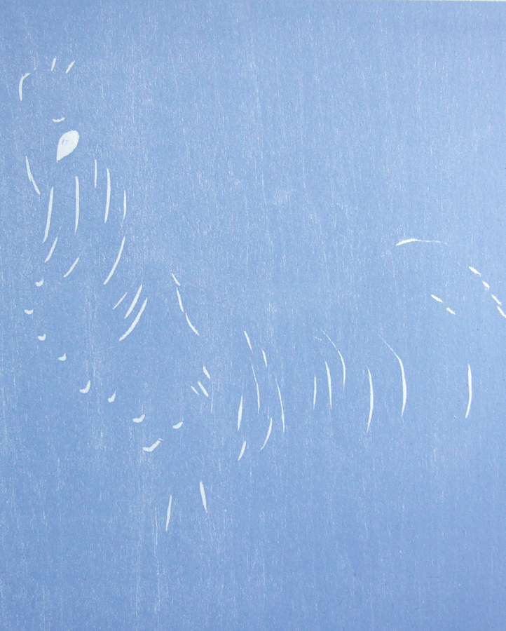 You can see that the first step was cutting away the parts I wanted to keep white. Then I printed the first color, blue, over the entire block. Next I cleaned off the block and then cut away the parts I wanted to keep blue. And finally I printed the second color, a grey-ish brown. Now you can see the original white lines plus the blue lines. I love watching the image gradually emerge as each color is printed.