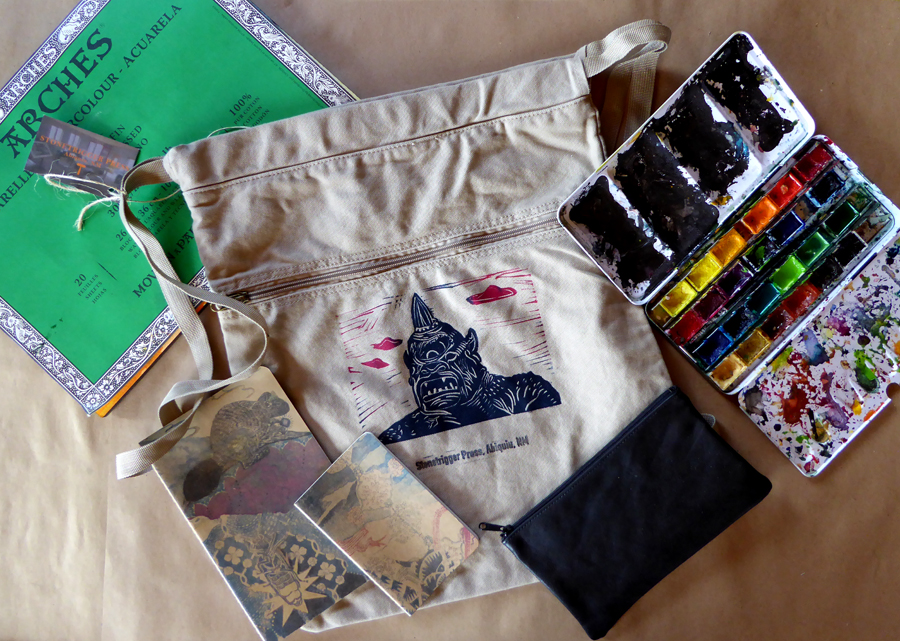 My travel kit of hand printed journals, a watercolor pad, watercolor, brushes, and UFO Cyclops bag is all packed up. I am going to Albuquerque for a couple of days then on to Roswell for some fierce sporting competitions, a tour of the UFO Museum, and a lot of sweating. It is going to be in the high 90’s all week.