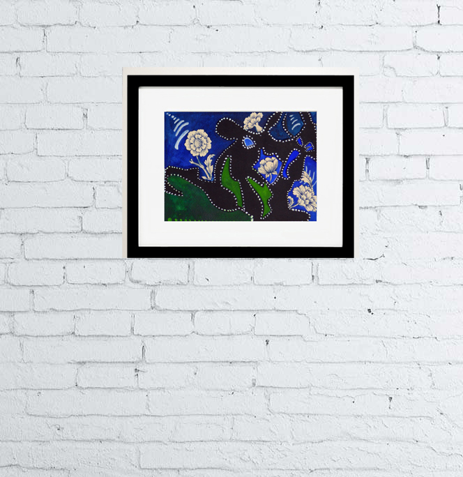 This 5″ x 7″ watercolor collage is very elegant. The black plant shadows are linocut printed, cut out and pasted to 300 lb arches watercolor paper. The blue flowers are hand cut antique Italian printed paper. The remaining blue, green and white are hand drawn layers of undulating color with my favorite Schmincke super high quality natural gums, water-soluble pigments.