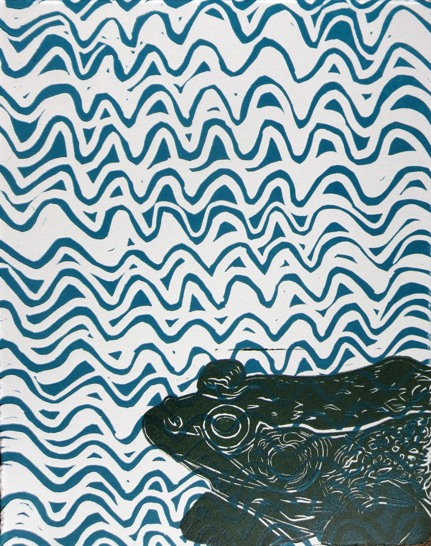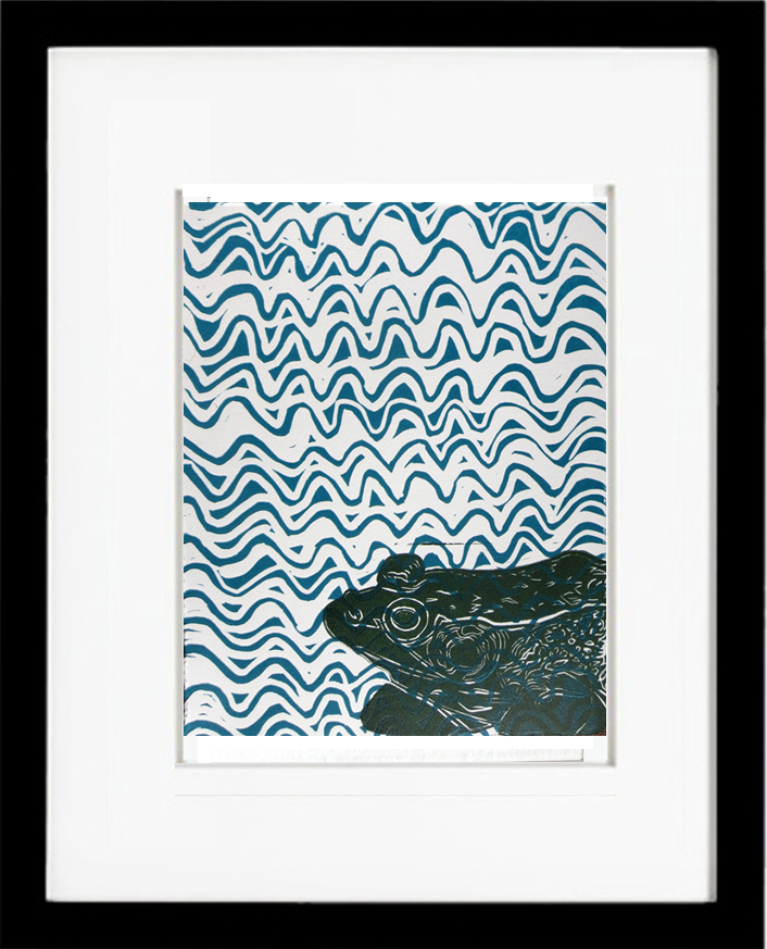 This is a two color, 2 layer print, the wavy blue background is printed onto 10″ x 8″ Rives BFK paper, and the frog is printed in green and translucent, you can see the translucency in the detail, the frog is 6″ x 4″. The hand printed block does not come framed, it is only for reference.