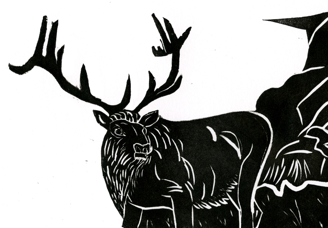 Fitting of yesterday’s run the Elk is my spirit animal of the week. The elk is associated with nobility, perseverance, endurance, relationships with others, stamina, strength, agility and pacing. I used all of these traits in yesterday’s run and called them up again this  morning to draw, carve and hand  print this weeks Spirit Animal Edition. I do this one day a week, each week, usually on Monday. Check back often as you animal may just show up next!