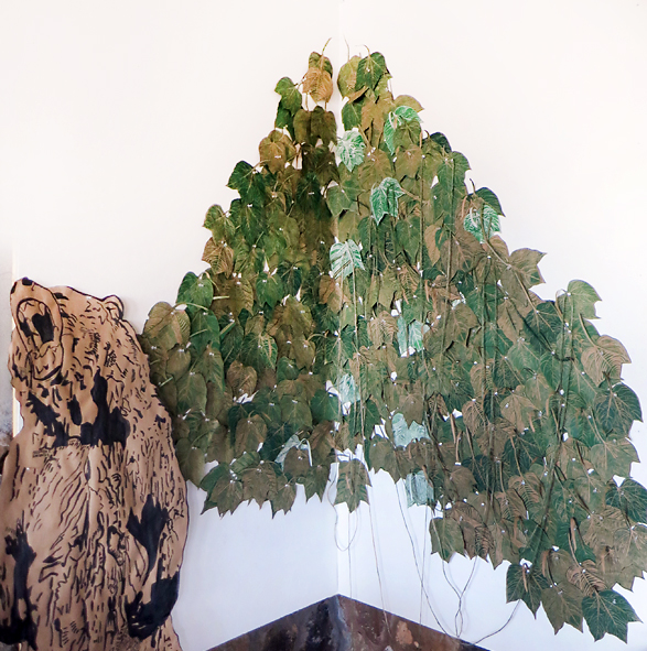 This 8′ x 8′ covered is being protected by the bear. I don’t know if he will be included, I just like thin there now.  I suspect I have enough cut outs to cover a 10′ x 12′ area. This is be installed in one corner of the gallery.   I am working on a 10′ x 12′ ink drawing of a mountain for a long wall.  The  base of the drawing will  be covered with loads of cut out plant silhouette, I will post photos as it develops. I can’t tell you how great it has been to have a whole year to develop this work.