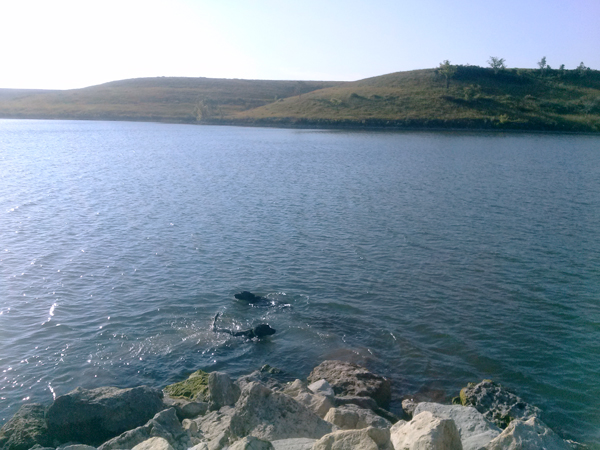 While at the KCAI,  Conrad and Homer get to hang out with the dog sitter. I already prepared them by taking a nice long swim this morning at Chase Fishing Lake in the beautiful Flint Hills of KS. Hopefully they will be a bit calmer after our 12 hour yesterday.