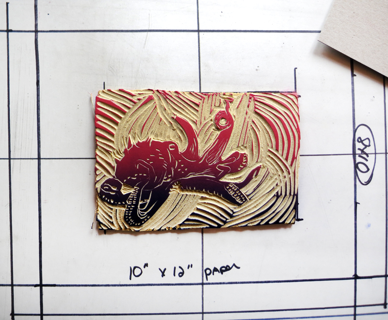 It is almost your birthday time, Pisces. Do you or a friend have a birthday between February 20 and March 20th? This would make a great gift. This linocut of the Pisces two fish, swimming, each have a chine colle, a collage while printing, of antique Italian printed paper, one is red and one blue.