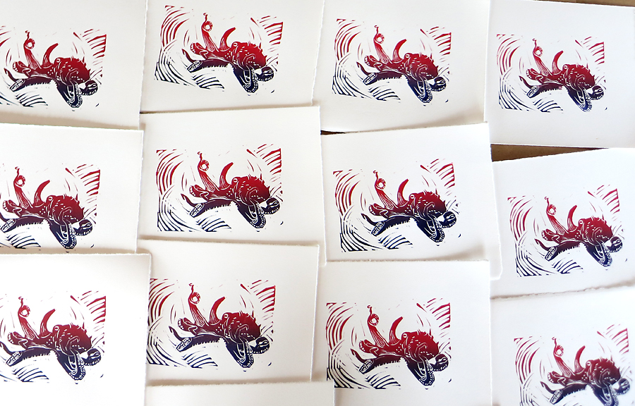 Each print is hand printed by the artist, me, Hilary Lorenz in my studio in New Mexico. Each morning I carve a new animal into my linoleum and print an edition of 10 and by 6pm MT, I put them on Etsy.