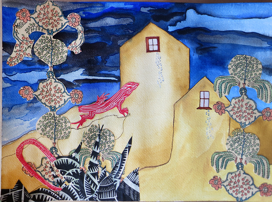 Spirit animal of the week? That’s right, it is the firefly. This is watercolor collage drawing #20, it will be sent to the framers to meet the other 19 tomorrow. It is a real wacky one, the fireflies are hand colored linoleum block prints slightly raised off the surface of the paper as it they are flying. Super Cool! These fireflies are here to remind you to, “shine your light.”